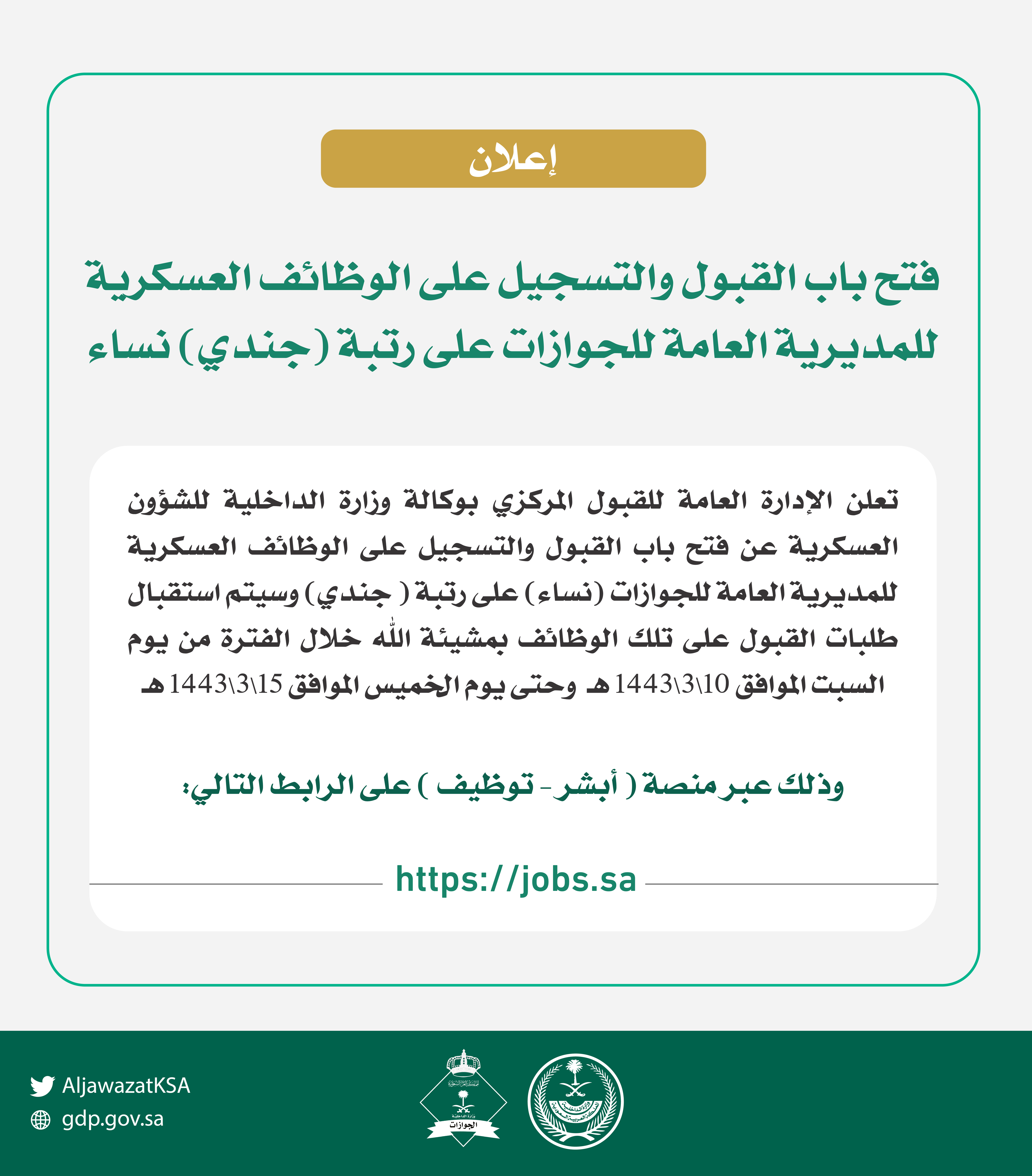 أعلنت الادارة العامة للقبول المركزي في وزارة الداخلية عن فتح باب القبول والتسجيل للكادر النسائي وذلك في المديرية العامة للجوازات على رتبة جندي على ان تكون اماكن التعيين في المديرية العامة للجوازات وجوازات الرياض والشرقية ومكة