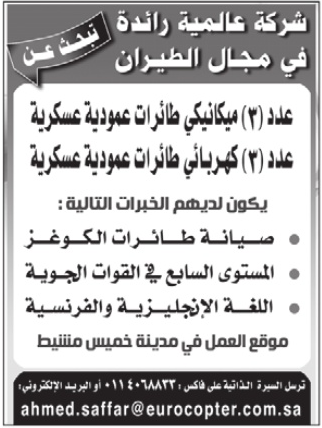 وظائف ميكانيكي وكهربائي طائرات عمودية في #خميس_مشيط
