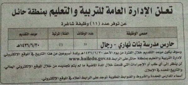 وظائف في #حائل حراس امن في مداس بنات على المرتبة أ