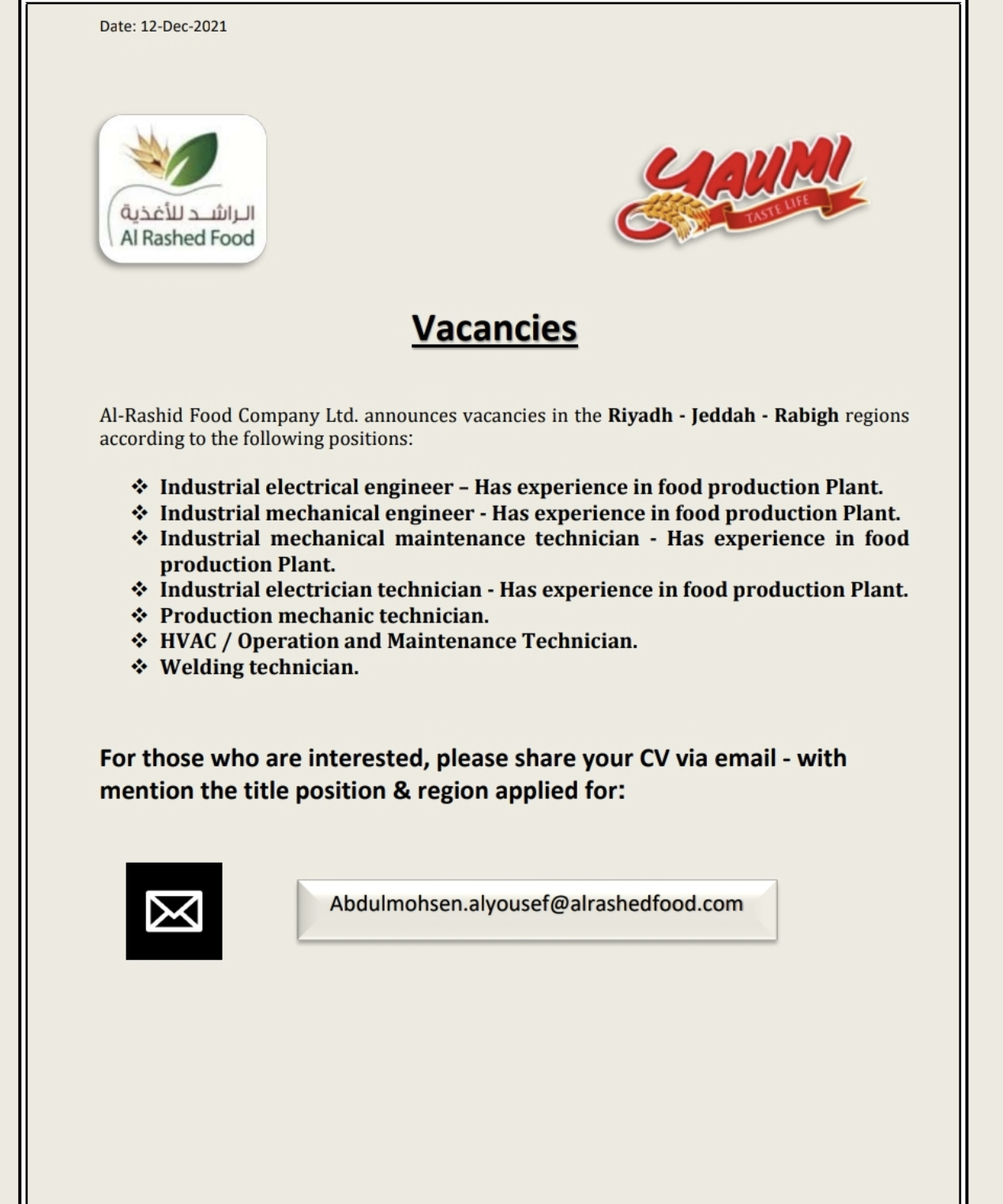 اعلنت شركة الراشد للأغذية عن وظائف مهندسين وفنيين في جدة والرياض ورابغ