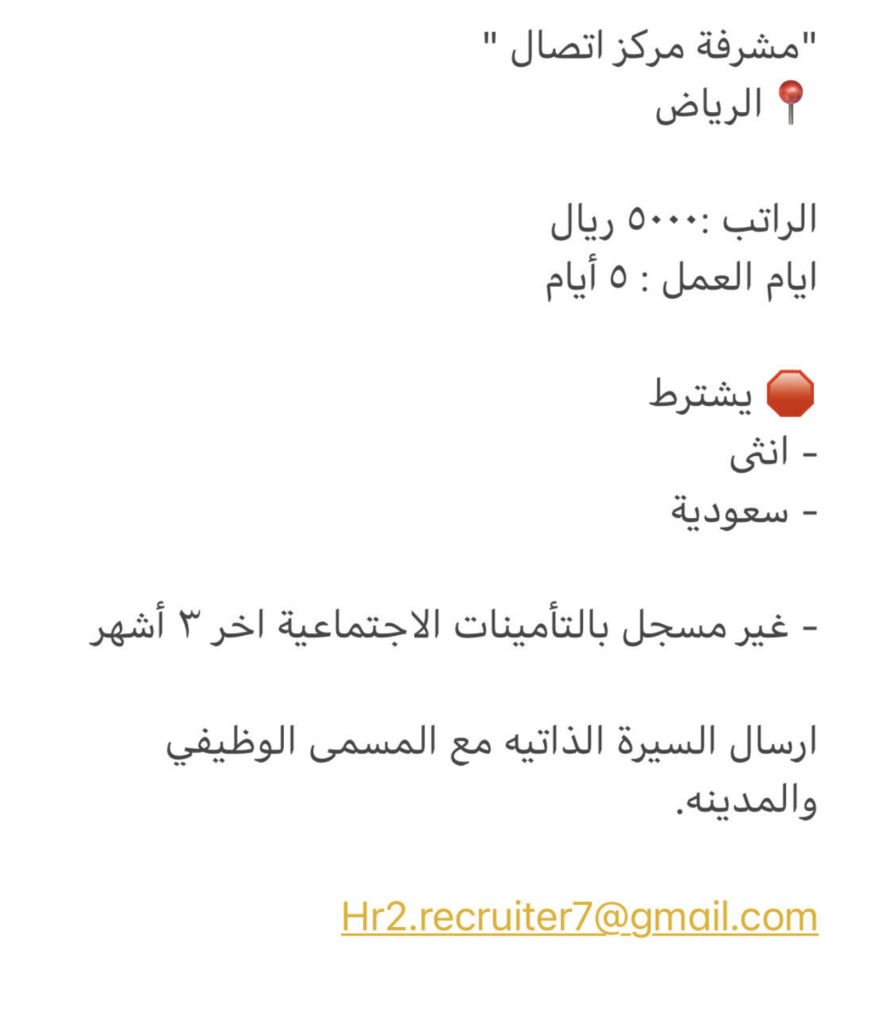 وظيفة مشرفة مركز اتصال في الرياض راتب 5000 ريال