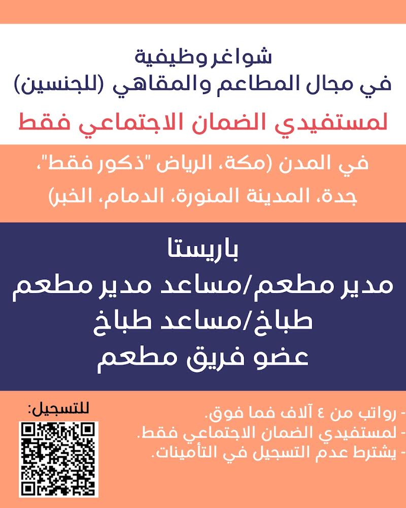 شواغر وظيفية في مجال المطاعم والمقاهي ((للجنسين لمستفيدي الضمان الاجتماعي فقط))🛑