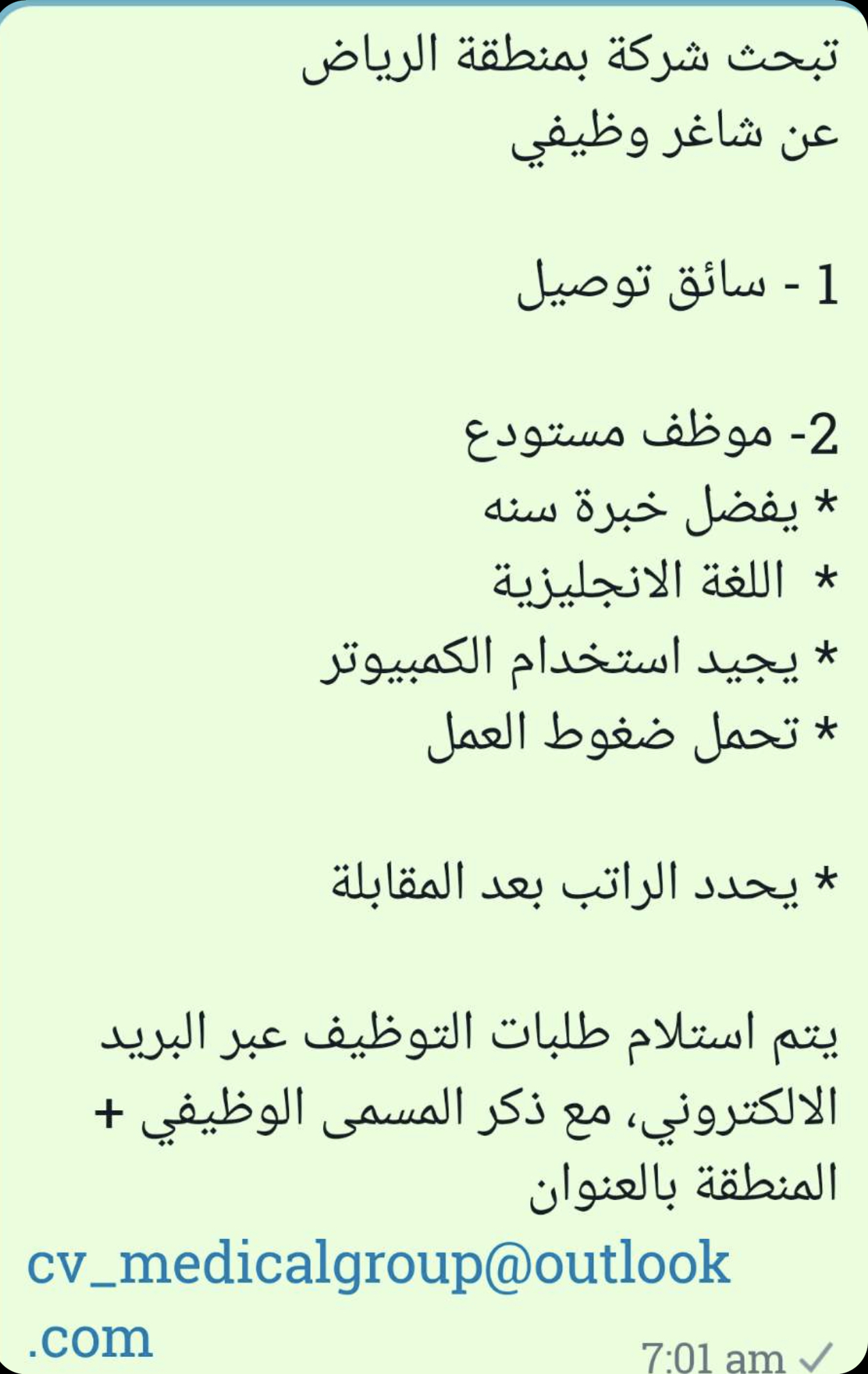 شركة في منطقة الرياض تبحث عن سائق توصيل وموظف مستودع