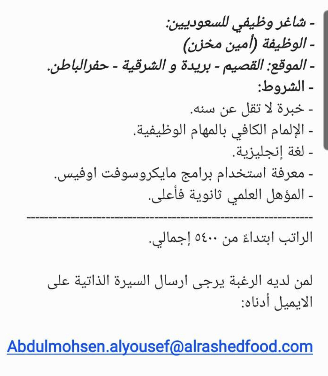 وظائف امين مستودع في #بريدة والشرقية و #حفر _الباطن