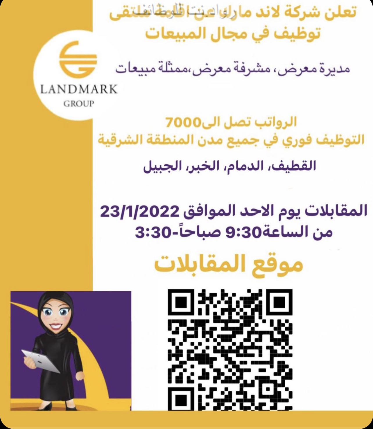 التقديم حضوري يوم الاحد 23 يناير لمعرفة موقع المقابلات يرجى مسح الباركود