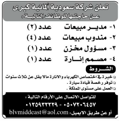 وظائف شركة سعودية المانية مدير ومندوبين مبيعات ومسؤول مخزن ومصمم انارة في #الشرقية