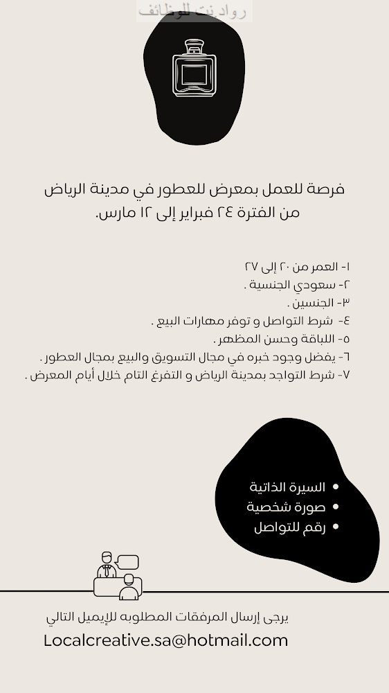فرصة للعمل في معرض العطور في مدينة الرياض من 24 فبراير إلى 12 مارس