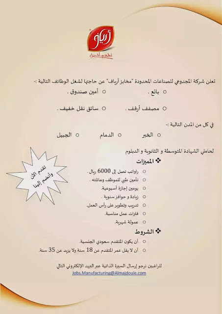 وظائف في شركة المجدوعي للصناعات المحدودة “مخابز أرياف”