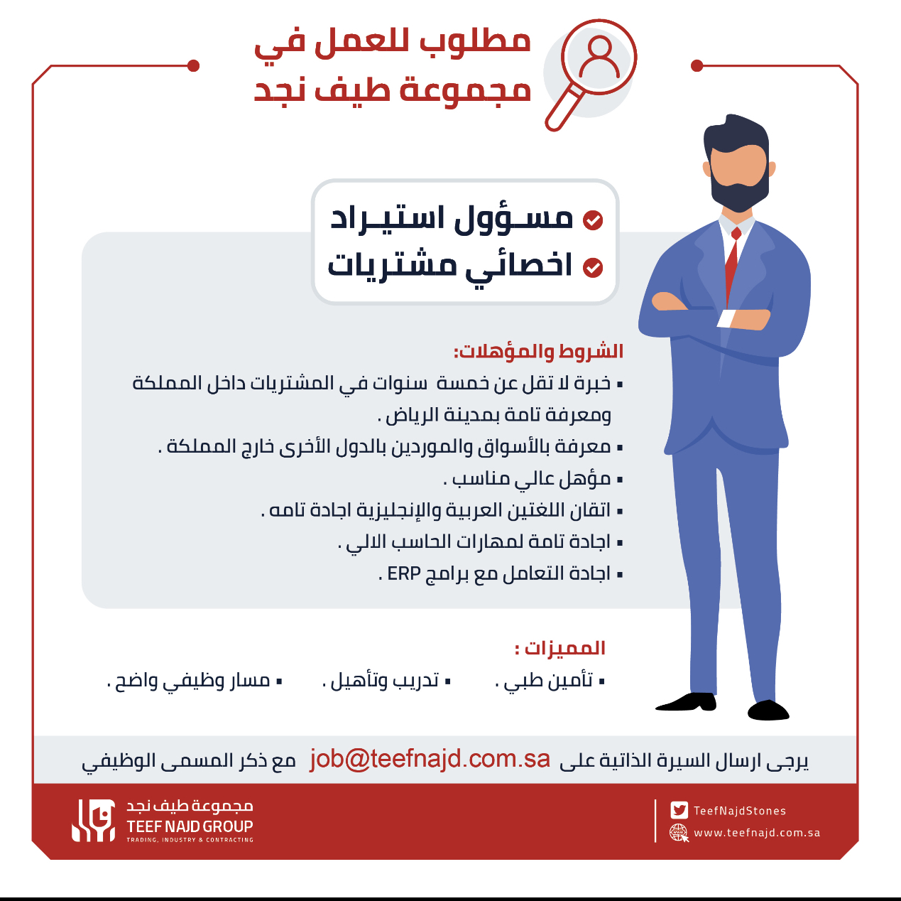 – خبرة لا تقل عن خمسة سنوات في المشتريات داخل المملكة ومعرفة تامة بمدينة الرياض . – معرفة بالأسواق والموردين بالدول الأخرى خارج المملكة .