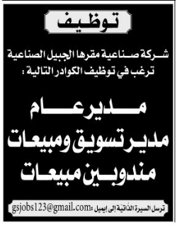 وظائف في #الجبيل الصناعية مدير عام ومدير تسويق ومبيعات ومندوبين مبيعات