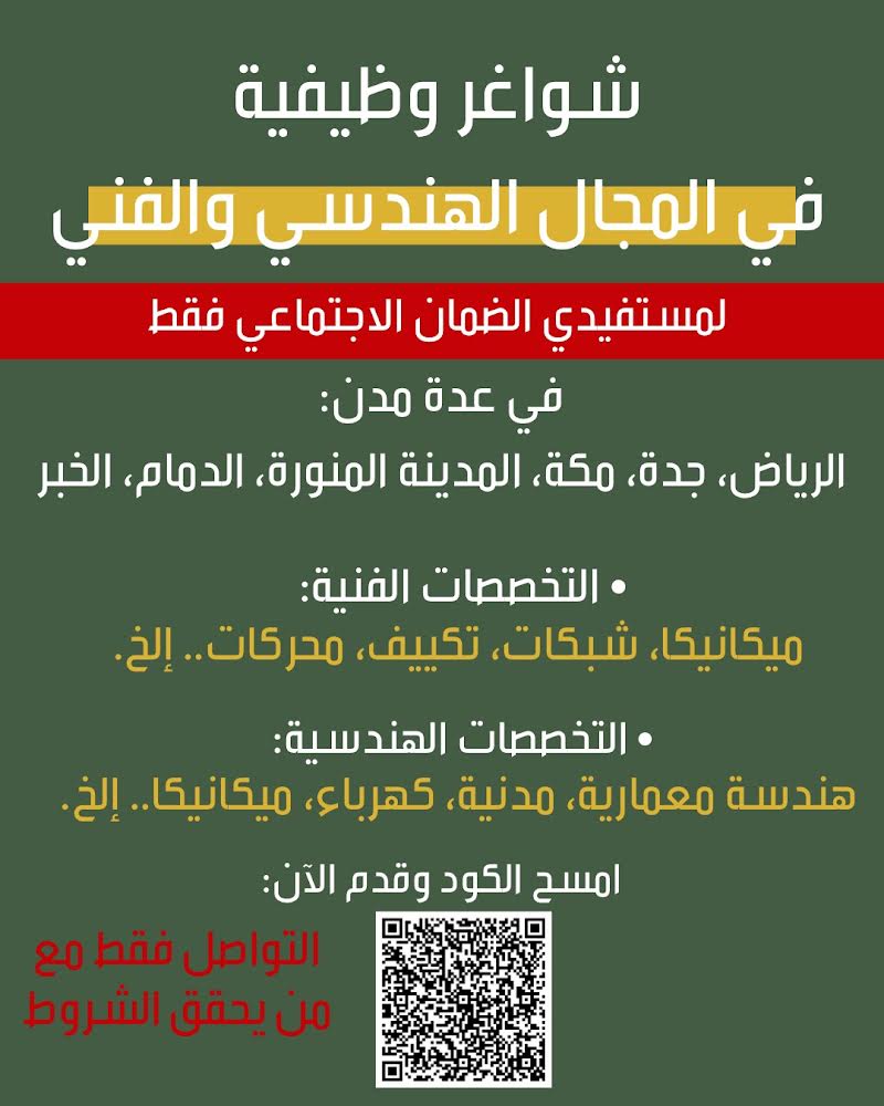 وظائف هندسيه وفنيه في عدة مدن لمستفيدي الضمان الاجتماعي