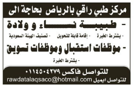 وظائف نسائيه في مركز طبي في الرياض طبيبه نساء وولادة وموظفات استقبال وموظفات تسويق