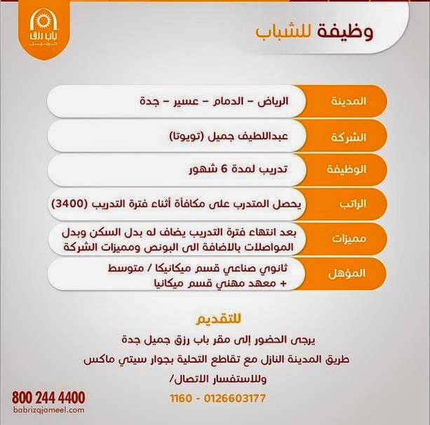 وظائف عبداللطيف جميل في #الرياض #عسير #جدة #الدمام تدريب منتهي بالتوظيف ومكافأة 3400 ريال