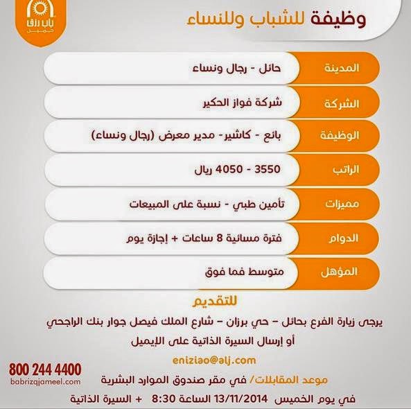 وظائف نسائيه ورجالية في #حائل في شركة فواز الحكير رواتب حتى 4050