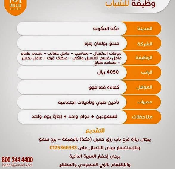 وظائف فندق في #مكة استقبال ومحاسب ومقدمي طعام وعمال