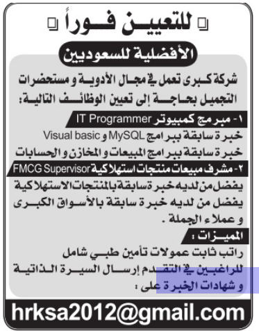 وظائف مبرمج كمبيوتر ومشرف مبيعات في شركة ادوية ومستحضرات تجميل