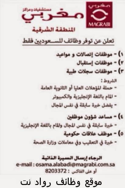 وظائف مستشفى مغربي في الشرقية #الدمام #الخبر موظفات اتصالات ومواعيد واستقبال وسجلات طبية وموظف علاقات حكومية