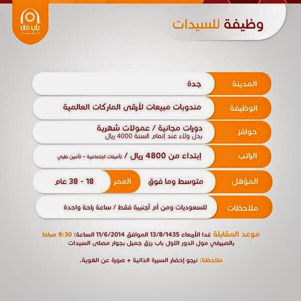 وظائف مندوبات مبيعات في جدة رواتب 4800 ريال التقديم بكرة الاربعاء – وظائف باب رزق جميل جدة 1435