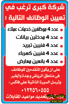 وظائف خدمة عملاء ومدخلين بيانات وفنيين تبريد وكهرباء وبائعين معارض – الرياض
