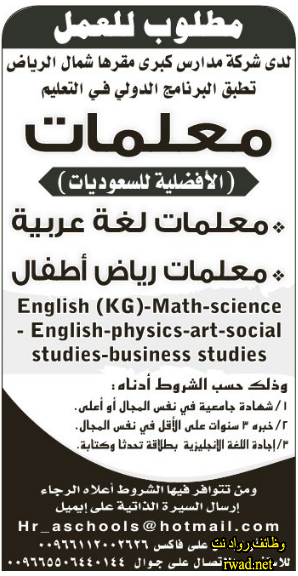 وظائف في مدارس كبرى في شمال الرياض تطبق البرنامج الدولي للتعليم معلمات مدرسات الافضلية للسعوديات لغة عربية ورياض اطفال السير الذاتية ترسل على الفاكس الظاهر لكم او الاتصال بالجوال للاستفسار