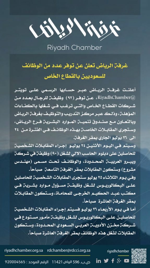 غرفة الرياض تطرح 180 وظيفة للشباب تعرف على مواعيد التقديم