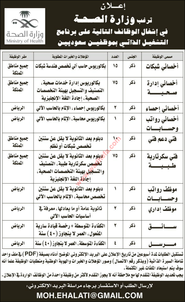 وظائف في وزارة الصحة وظائف فنية وصحية وإدارية (للرجال) على برنامج التشغيل الذاتي في كافة مناطق المملكة على النحو التالي: