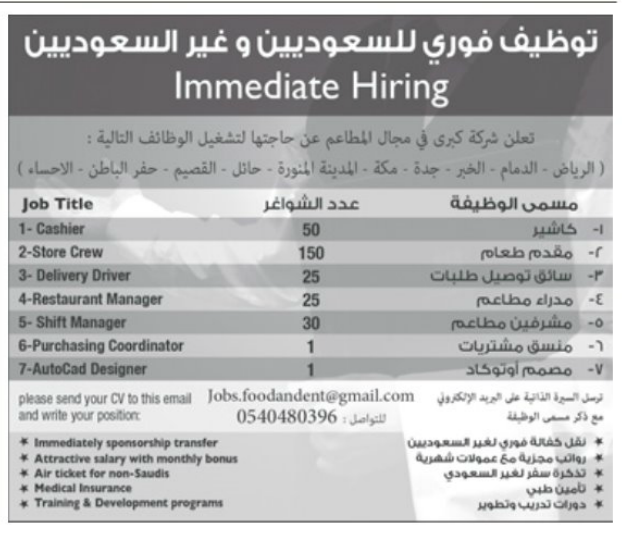 وظائف منوعة وبأعداد كبيرة في الرياض والدمام والخبر وجدة ومكة والمدينة المنورة وحائل والقصيم وحفر الباطن والاحساء الوظائف للسعوديين والاجانب التقديم من خلال ارسال السيرة الذاتية على [email protected] او الاتصال رقم الهاتف 0540480396