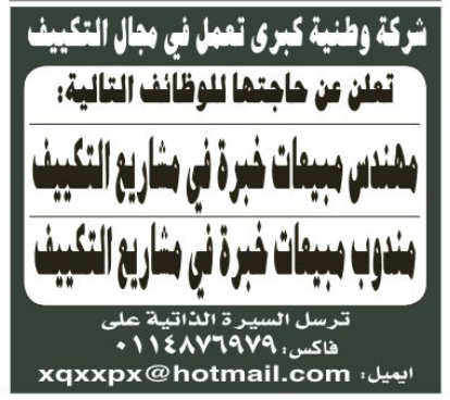 وهذه شركة تعمل في مجال التكييف تطلب مهندس مبيعات ومندوب مبيعات