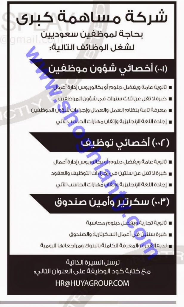 وظائف شاغرة اخصائي شؤون موظفين واخصائي توظيف وسكرتير وامين صندوق في الرياض