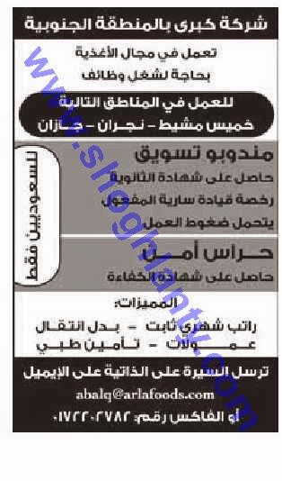 وظائف نجران وجازان وخميس مشيط 1435 مندوبي تسويق وحراس امن لحملة الثانوية العامة
