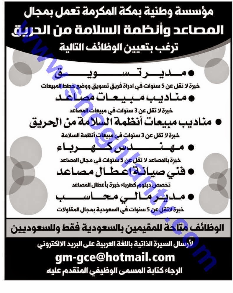 وظائف في مكة المكرمة مدير تسويق ومندوبي مبيعات ومهندس كهرباء وفني صيانة ومدير مالي للسعوديين والاجانب